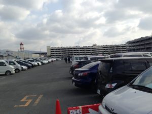 お客様の注文の車両を探して、広い会場を歩いて下見します。
