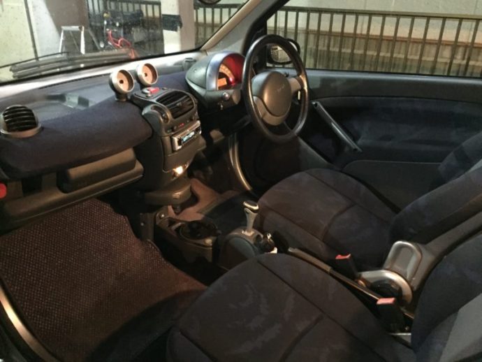 ひょうたん型?落花生?がたのライトのマスクの後期型のスマートです。シルバーのセルにブラックのカラーの軽登録のおクルマです。